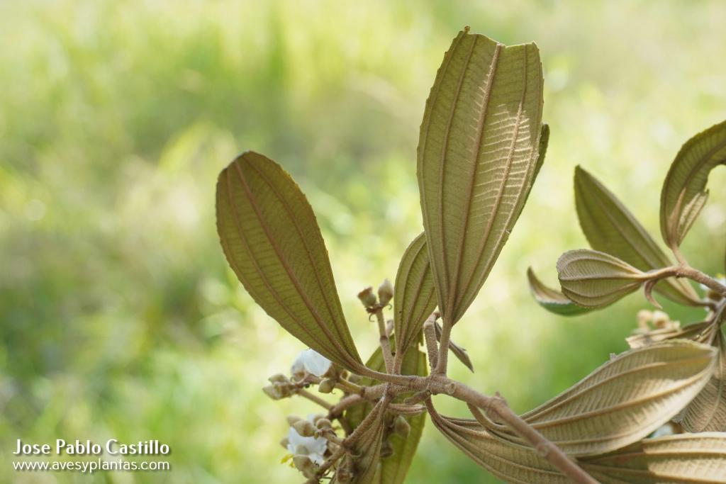 Descripción: Arbusto o árbol pequeño de 3-15m. Hojas simples, opuestas, sin estípulas, con lámina de 5–17 × 1.7–7 cm. Se reconoce por la pubescencia estrellada y la tonalidad pardo-blancuzca en el envés de sus hojas. Flores con 5 pétalos de color blanco a rosado. Frutos son bayas moradas de 7–9 mm(1).