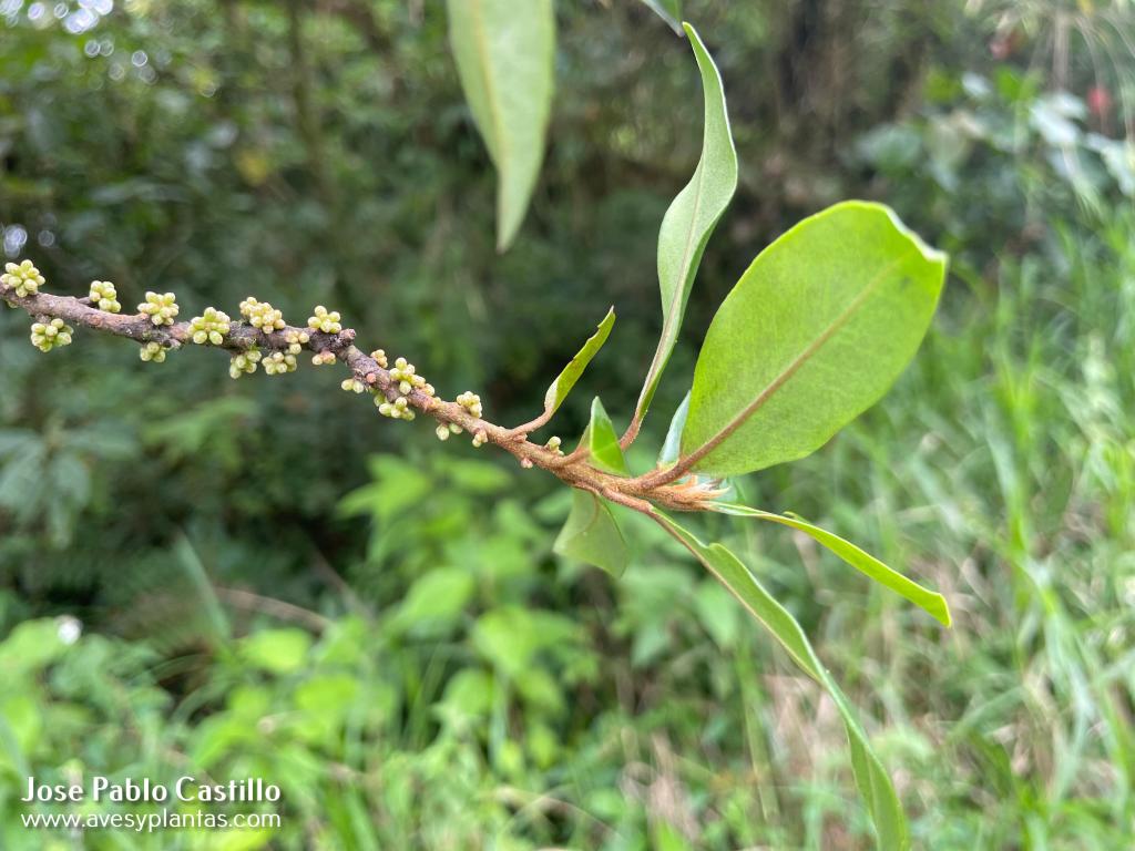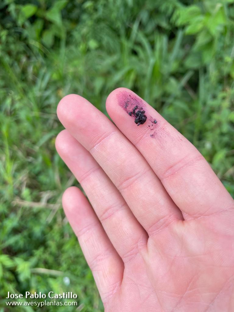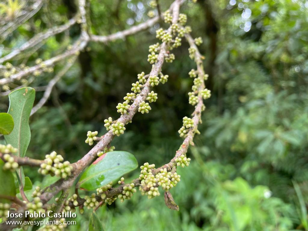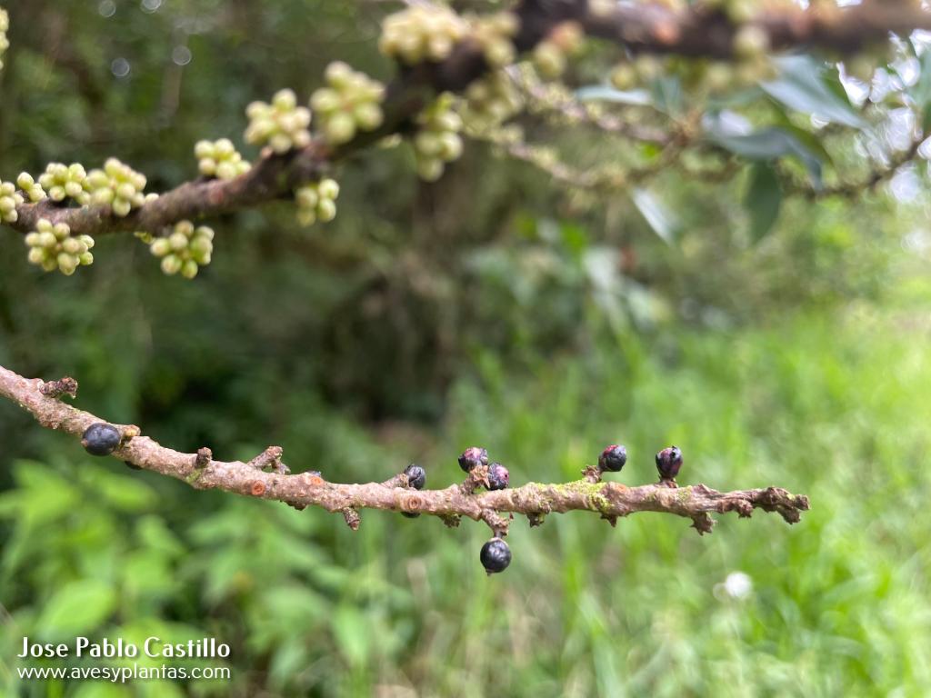Descripción: Árbol de 2-10 m.(1). Hojas simples, alternas, sin estípulas, con pubescencia ferrugínea usualmente presente en las ramitas, las yemas y el nervio medio de las láminas foliares en el envés. Al igual que todas las especies de este género, presenta inflorescencias axilares, caulifloras y muy cortas, que parecen aglomeradas o fasciculadas. Flores color crema o rosado. Frutos son drupas globosas negro o morado-verdoso al madurar.