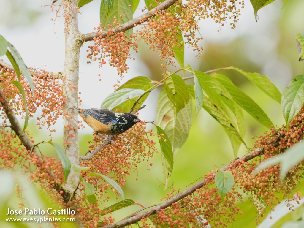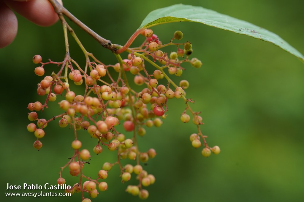 Familias de aves observadas alimentándose de sus frutos: Cardinalidae, Fringillidae, Passerelidae, Pipridae, Semnornithidae, Thraupidae.