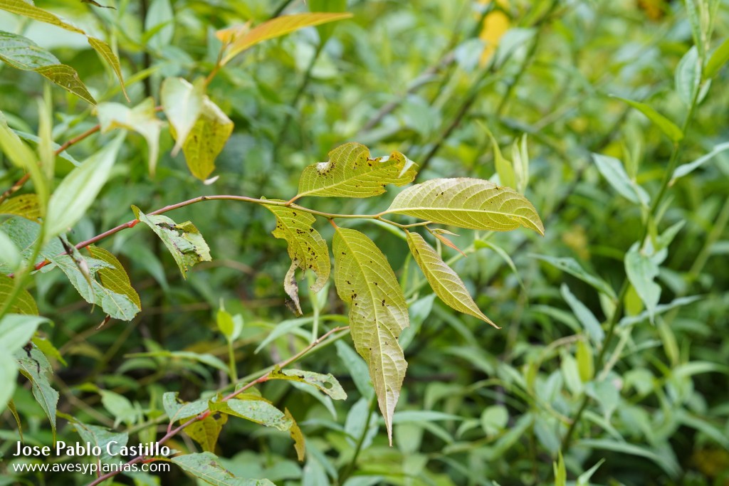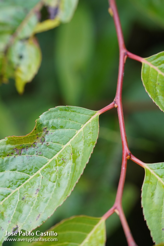 Descripción: Arbusto a árbol de 3-25 m (usualmente entre 4-12 m). Hojas simples, alternas, con pequeñas estípulas deltadas y decíduas. Hojas con el pecíolo a veces rojizo y lámina de 7-20 x 3-8 cm con forma ovada a lanceolada, o más frecuente oblongo-elíptica; cuneada a redondeada en la base y acuminada en el ápice; márgen crenulado-serrado. Inflorescencias panículadas, de 4-9 cm, crecen en nudos con hojas. Flores caedizas, con pétalos valvados, muy pequeñas, amarillentas o verduzcas. Frutos verdes a amarillos a de rojizos a rojo oscuro o morados al madurar(1).