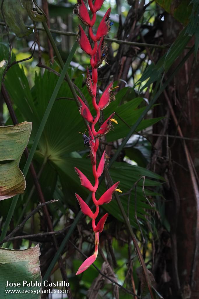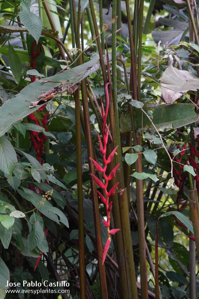 Descripción: Hierba de 5-7 m. Hábito semejante a una Musa (banano). Presenta de 4-7 hojas por tallo, las cuales tienen medidas de 170–300 × 35–55 cm con un revestimiento blanco ceroso en el envés. Presenta inflorescencias péndulas de hasta aproximadamente 160 cm, con 12-40 brácteas cincinadas de color rojo a anaranjado-amarillo, a veces amarilla cerca del raquis con 10-20 flores por cincino.(2)